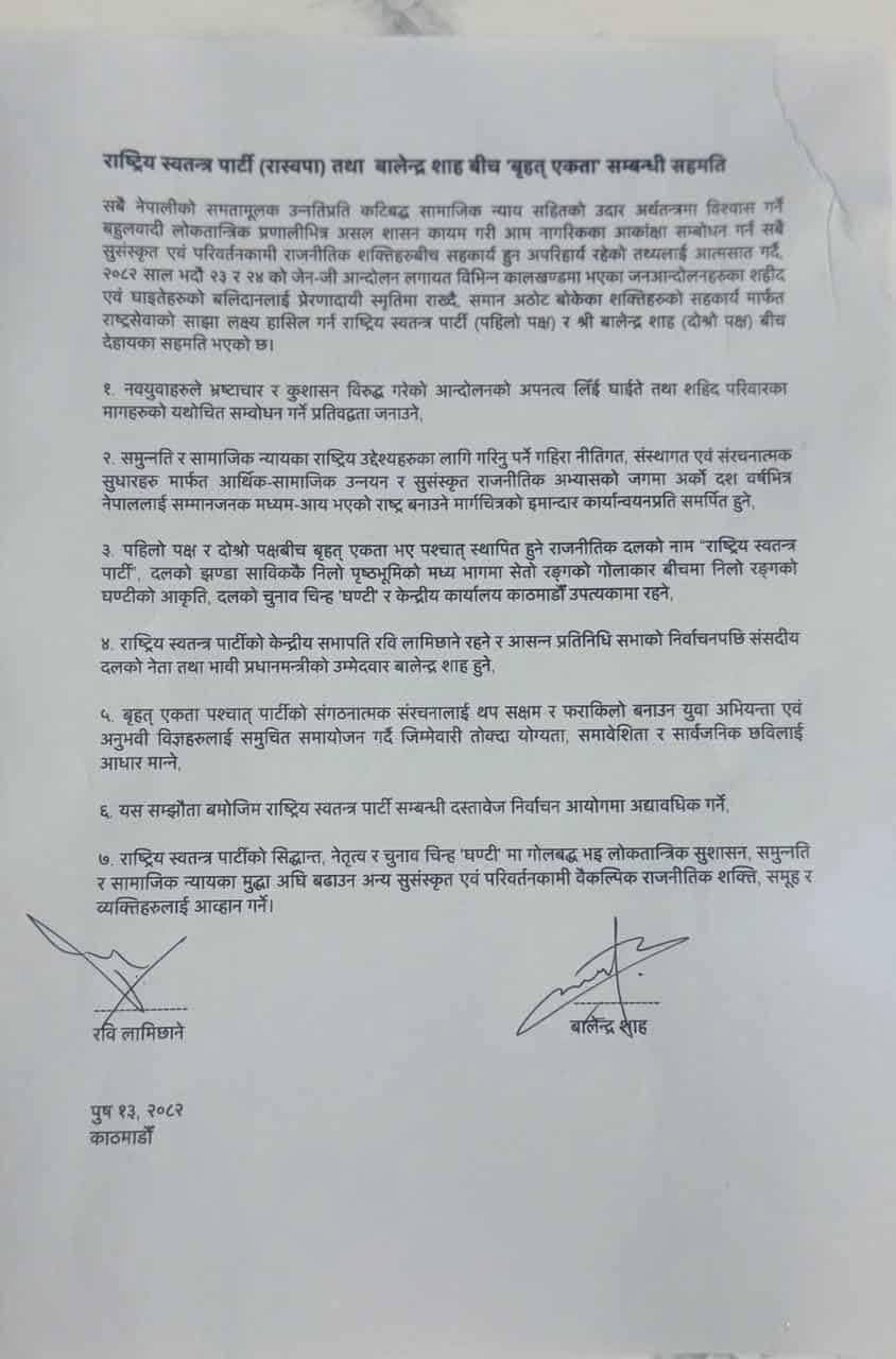 काठमाडौं , राष्ट्रिय राजनीतिमा नयाँ ध्रुवीकरणको संकेत गर्दै राष्ट्रिय स्वतन्त्र पार्टीका सभापति रवि लामिछाने र काठमाडौं महानगरपालिकाका मेयर बालेन्द्र शाह (बालेन) बीच ७ बुँदे सहमति भएको छ।